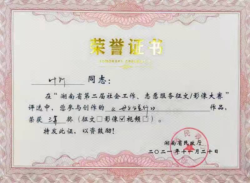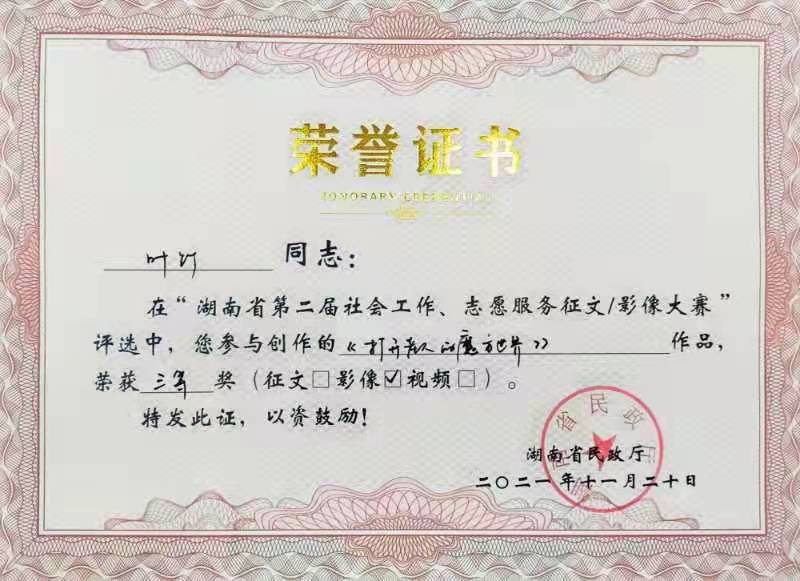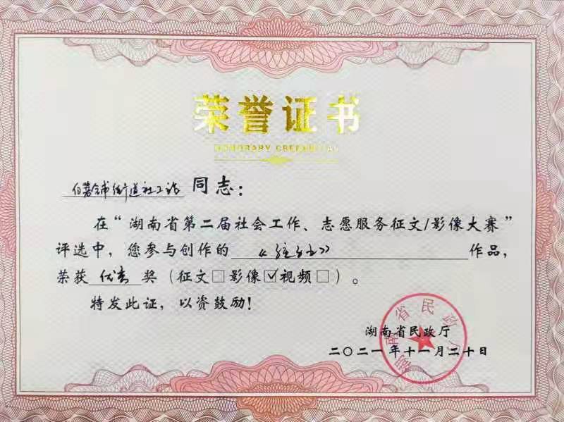 2021年,我司多名員工積極踴躍投稿參與由湖南省民政廳主辦、湖南公共頻道承辦的湖南省第二屆社會工作、志愿服務(wù)征文暨影像大賽。他們講述平凡而偉大的故事,展現(xiàn)社會工作者精神風(fēng)貌,傳播真善美,弘揚正能量。其中兩篇原創(chuàng)征文作品、三幅原創(chuàng)影像作品在比賽中脫穎而出,榮獲一等獎1個、三等獎3個、優(yōu)秀獎1個。